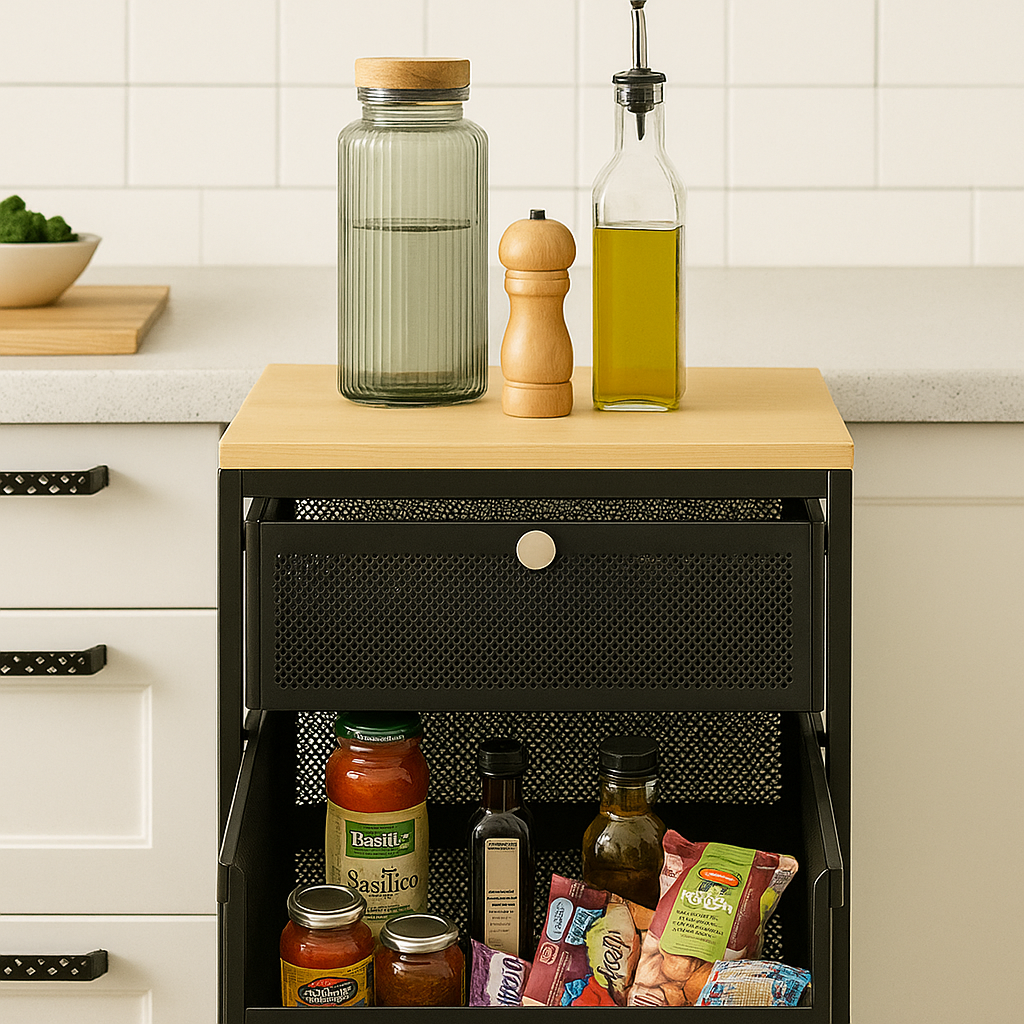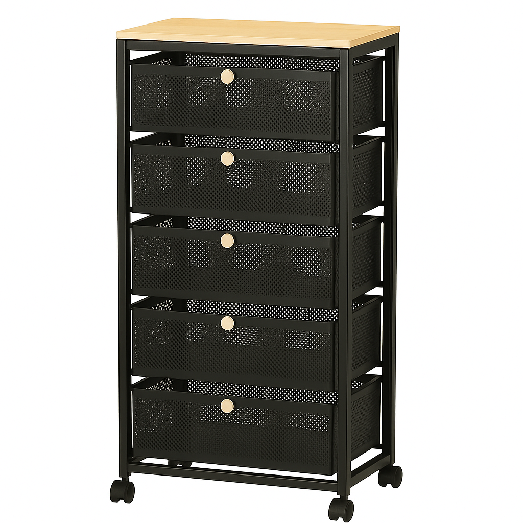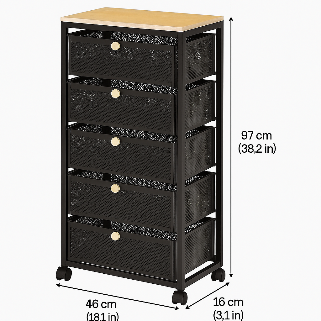 Deze multifunctionele keuken trolley is de perfecte combinatie van stijl en functionaliteit. Met een stevig metalen frame, geperforeerde lades, en een houten bovenblad, voegt dit meubelstuk een moderne en industriële uitstraling toe aan elke ruimte.