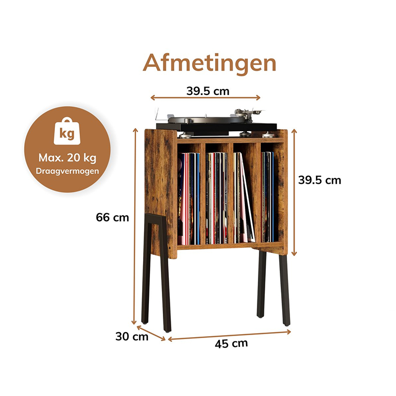 Specificaties: Merk: Luxaliving Kleur: vintage bruin Afmetingen: 45 x 30 x 66 cm (L x B x H) Platform platenspeler: 39,5 x 30 cm Materiaal: MDF + metaal Gewicht: 6,4 kg Capaciteit: 72 platen