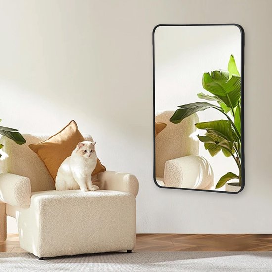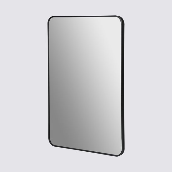 Belangrijkste kenmerken: Afmetingen: 60 cm breed x 90 cm hoog Framekleur: Zwart Framedikte: 2,8 cm Materiaal: Hoogwaardig metaal & glas Design: Minimalistisch en modern, met afgeronde hoeken Ophangmogelijkheden: Zowel horizontaal als verticaal (controleer of dit klopt) Toepassing: Ideaal voor hal, badkamer, slaapkamer of woonkamer