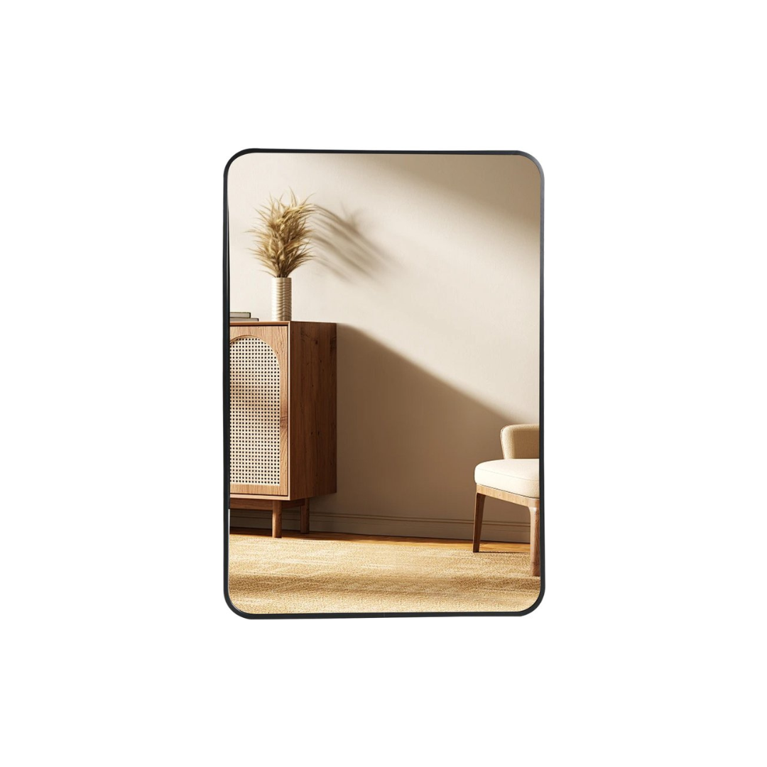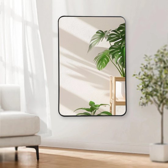 Breng stijl en functionaliteit samen met deze moderne rechthoekige wandspiegel. Met een elegant zwart metalen frame van 2,8 cm dikte en afgeronde hoeken straalt deze spiegel eenvoud en klasse uit. Perfect geschikt voor de hal, badkamer, slaapkamer of woonkamer. Dankzij het formaat van 60 x 90 cm is de spiegel groot genoeg voor dagelijks gebruik, terwijl hij ook een decoratieve blikvanger is aan de muur.