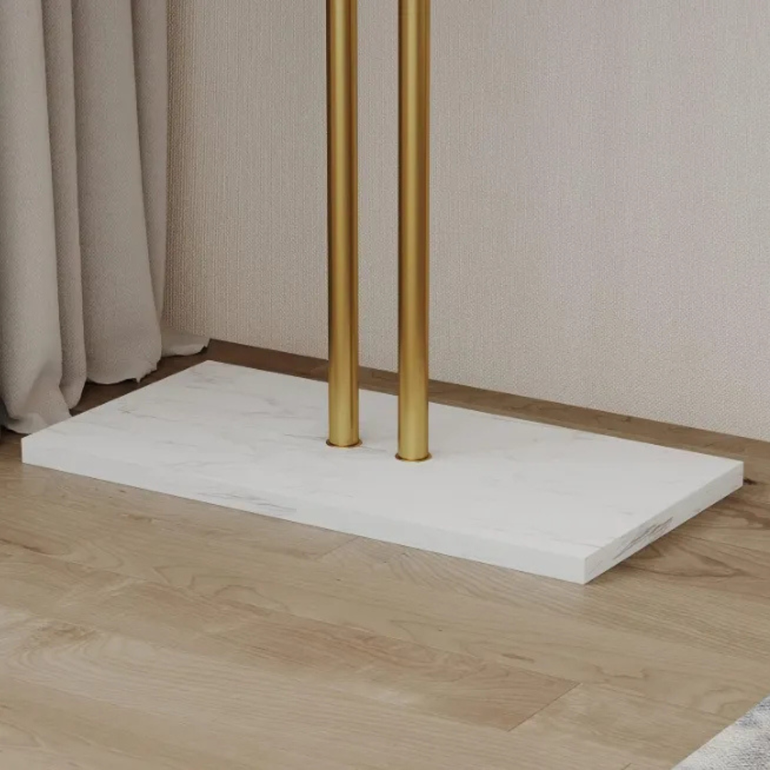Stijlvol en praktisch: deze Luxaliving staande kapstok met witte marmeren voet en 5 gouden haken houdt je kleding netjes en overzichtelijk. Perfect voor hal, slaapkamer of garderobe, met een elegant design dat luxe en functionaliteit combineert.